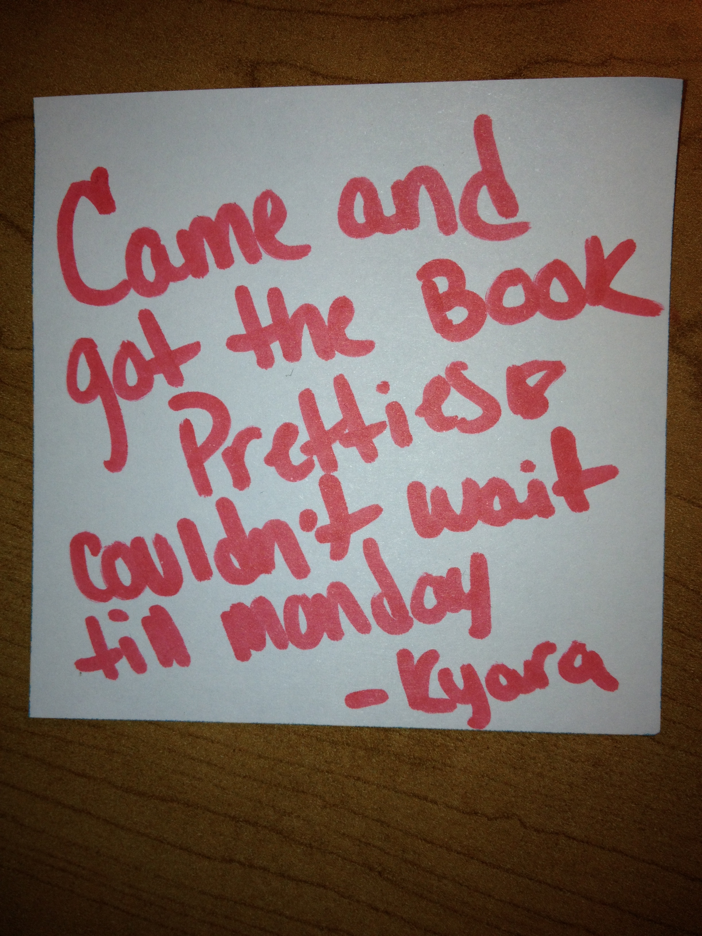 I’ve already written about fangirling in such a way that gets students excited and informed about books. Once a student knows what he or she wants to read, the only problem is tracking that book down. I took an idea from Emily and started a “reading wait list” whiteboard, where students can leave a public request for something they’ve been clamoring for. In terms of determining who’s got what, I have a binder that lies on the cabinet near the bookshelf where kids check books in and out. Because I show them my grants and letters, and I rip open the boxes of freshly-delivered books in front of them, they can see the hard work being done to build the library. I think that’s what makes them so conscientious about returning books, because they’ve been great about that so far.