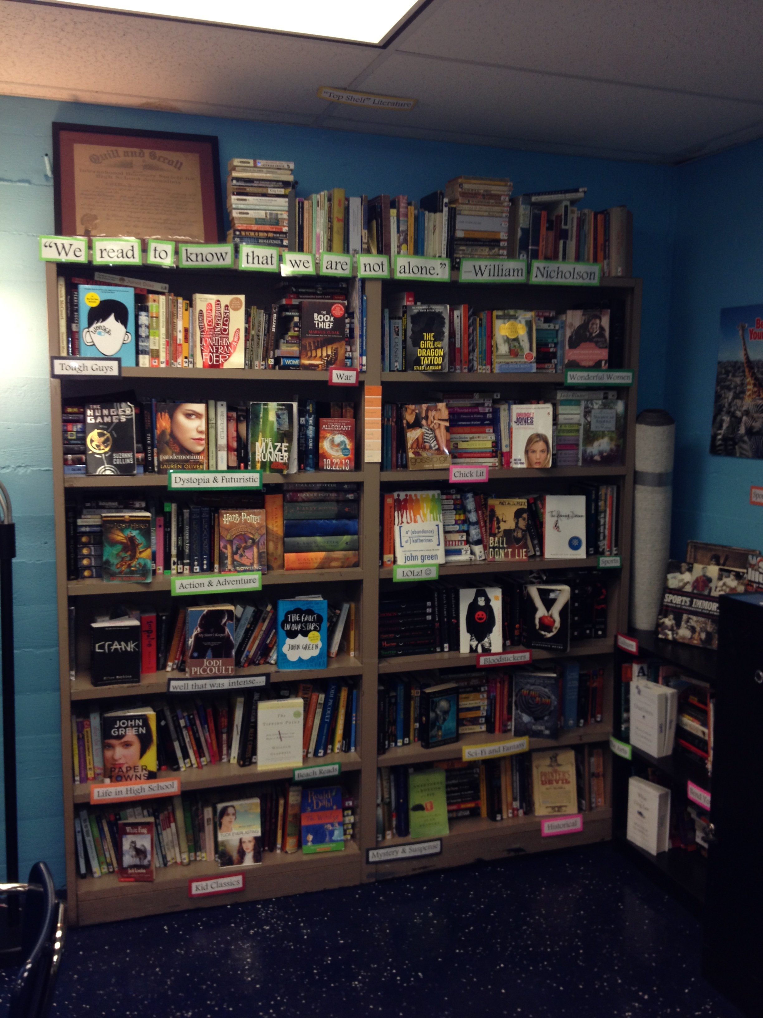 Once I had my books, I knew I wanted to organize them in a fun way that spoke to my teaching style. My students and I came up with some inventive categories–“Top Shelf Lit” (classics, which are actually on the top shelf), “Bloodsuckers” (vampire novels), “LOLz” (humor), and “well that was intense” (books about death/powerful issues that will make you cry). A wonderful problem I’ll need to tackle soon is where to find another bookshelf!