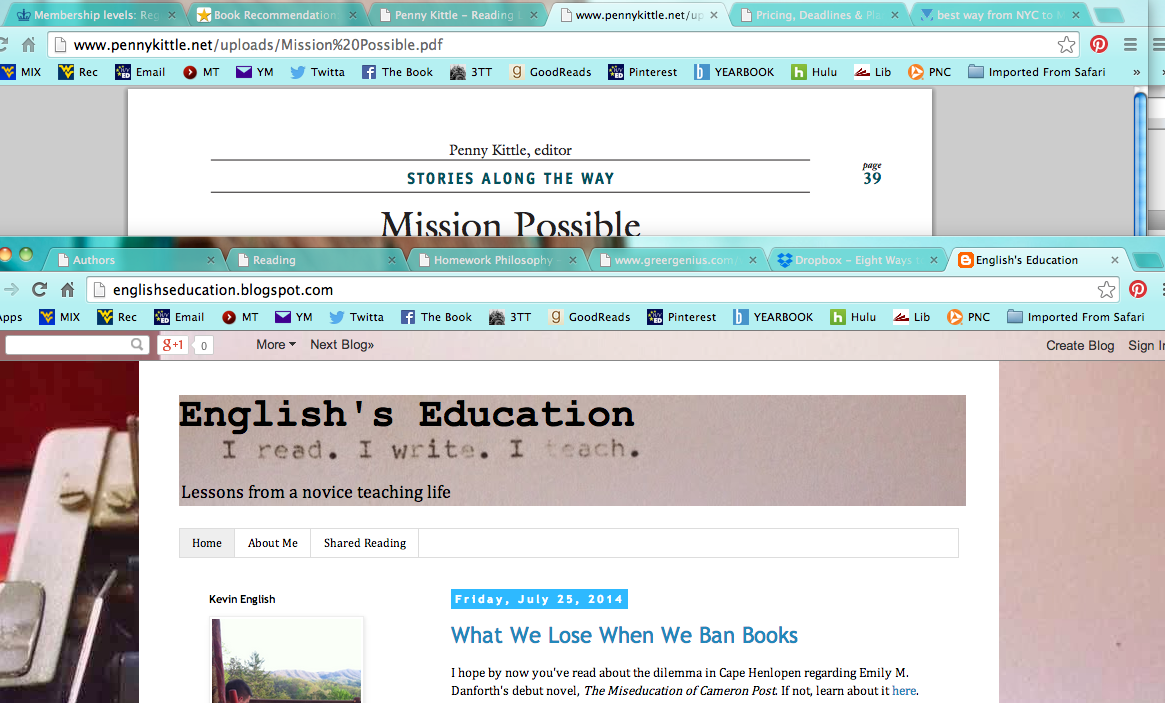 For two years now, I’ve learned most of my daily classroom practices from Penny Kittle. However, what I’ve really begun to pay attention to is that by reading Penny’s writings and taking her classes, I’m not just learning from her. I’m learning from Don Murray, Don Graves, Kelly Gallagher, Louise Rosenblatt, Katie Wood Ray, Tom Romano, Teri Lesesne, Donalyn Miller, Alfie Kohn, Nancie Atwell, and many more. Penny has expertly absorbed the ideas of all of those other teacher-writers, and seamlessly integrated them into her own philosophy and craft. That is my goal–not to mimic Penny or any of those other teaching geniuses, but to meld all of their research findings into my own practice; to become the sum of my mentors, as Meenoo Rami says. Of course, that’s easier said than done, but definitely worth the attempt–and the hefty credit card bill that comes after a Heinemann ordering spree.