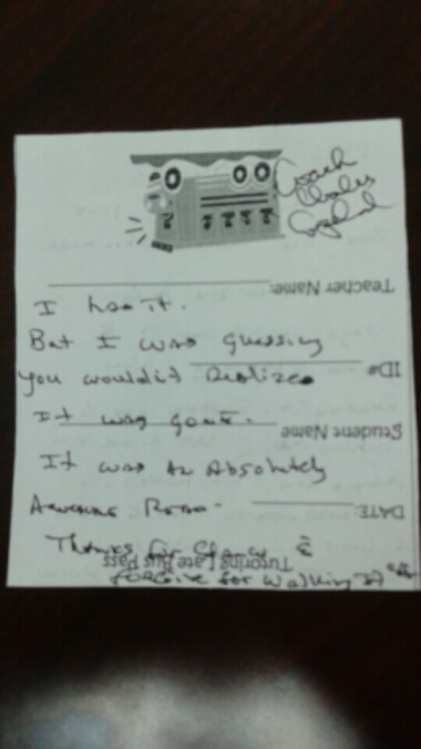 I go to my box in the workroom this morning, and I find this note: