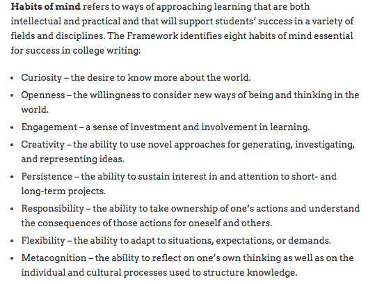 The aha hits me:  These habits of mind are what my readers and writers workshop instruction is all about:  a “way of approaching learning that is both intellectual and practical and that will support students’ success in a variety of fields and disciplines.” At least I try to make it so.