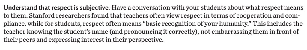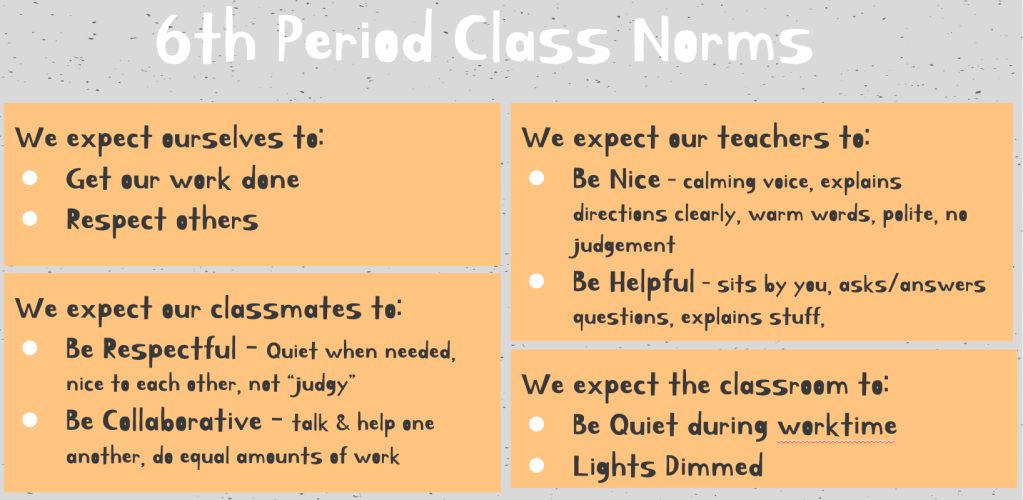 Vulnerability with students is more important than control. The first week we spent a lot of time on community building and setting expectations in our class. Our class spent two days creating our class norms, which were what I had hoped they would say without me writing them myself. But I realized right after doing this activity that their definition of respect was not the same as mine. They knew what they were “expected to do in school” but application of those norms was NOT as easy for them and I lost my cool the first week of school. So embarrassed, I reflected right away with colleagues and later in the evening came across the article, “Reframing Classroom Management: A Toolkit for Teachers,” on the Learning for Justice website and the paragraph below hit me. I wanted my students to be compliant, but that isn’t what respect is to them. They really just want their teachers to get to know them. The next day I started class with an apology for my actions and shared what I reflected on. We had an honest discussion about how hard it is to be back in school after 18 months and what they need from me. The most common response: belief in them, positivity, and encouragement even when they do things that I think are better suited for hanging out with friends.
