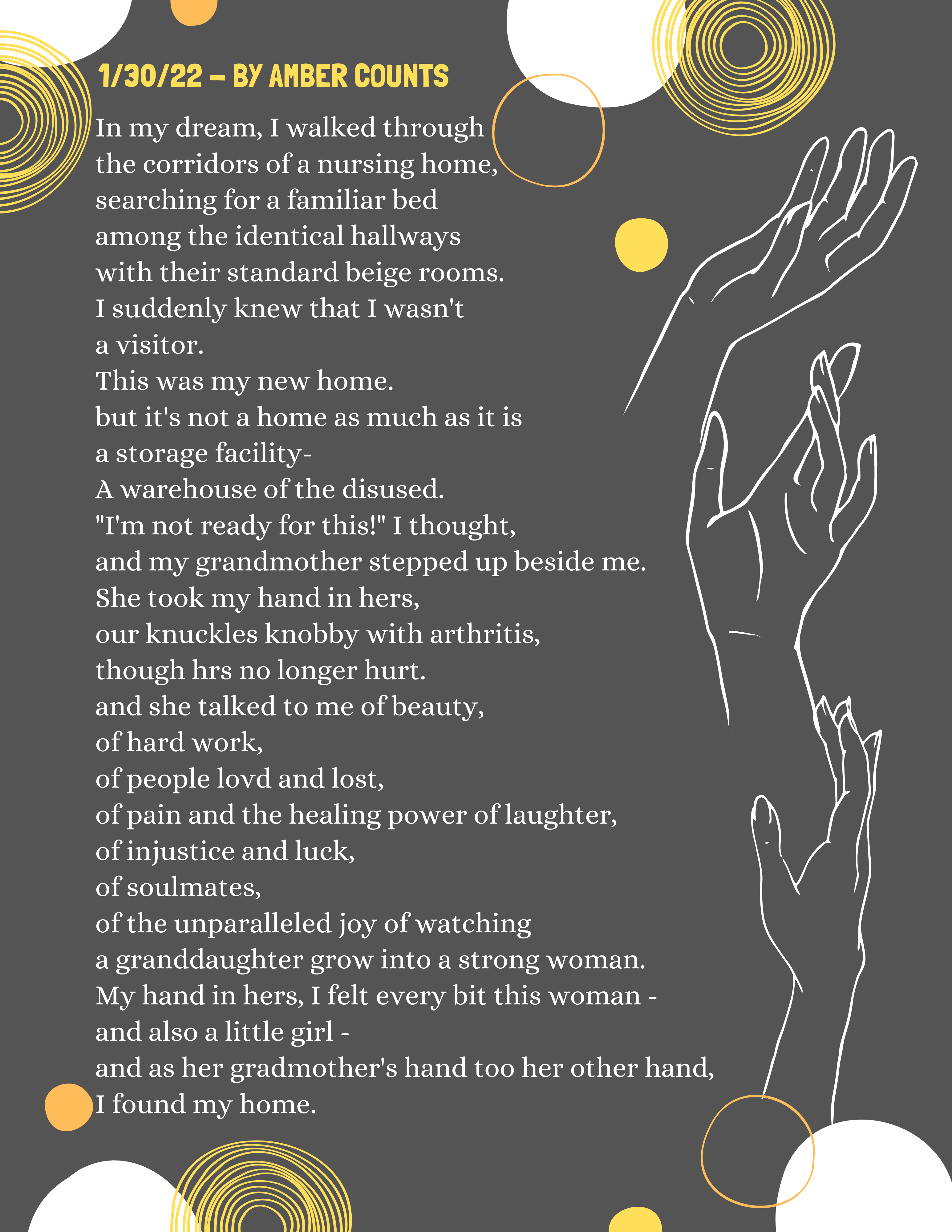 The idea of keeping a dream journal is nothing new; I have even tried to remember to do this before. However, the pressure of writing about a dream in a linear, prose style proved difficult and even cumbersome. Thus, I have started recording my dreams as poems. There is no pressure to make sense. I am free to incorporate snapshots. I don’t need to provide context.