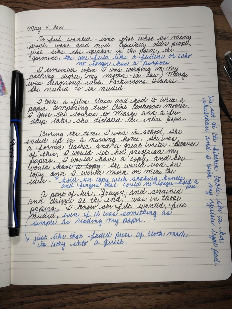 When I read this poem, I immediately thought about elderly people, people who sometimes don’t feel wanted or needed. I taped the poem inside my notebook and wrote beside it. I wrote about my mother-in-law during the time I returned to college to become a teacher. She had Parkinson’s disease and was confined to a wheelchair, but she would help me write my papers. It was a special time between us, and I am glad I captured these moments in my notebook.