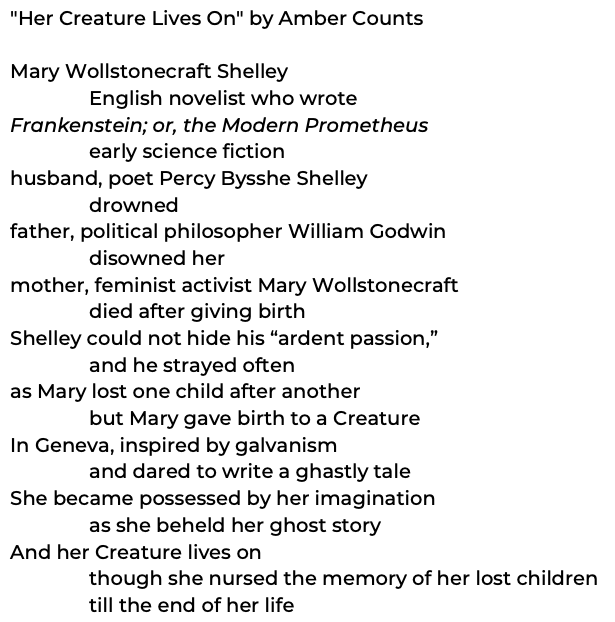 Giving myself the guidelines of writing a poem constructed from at least one phrase from each of the sections from “life and career” through “reputation,” here is a found wiki-poem on Mary Shelley: