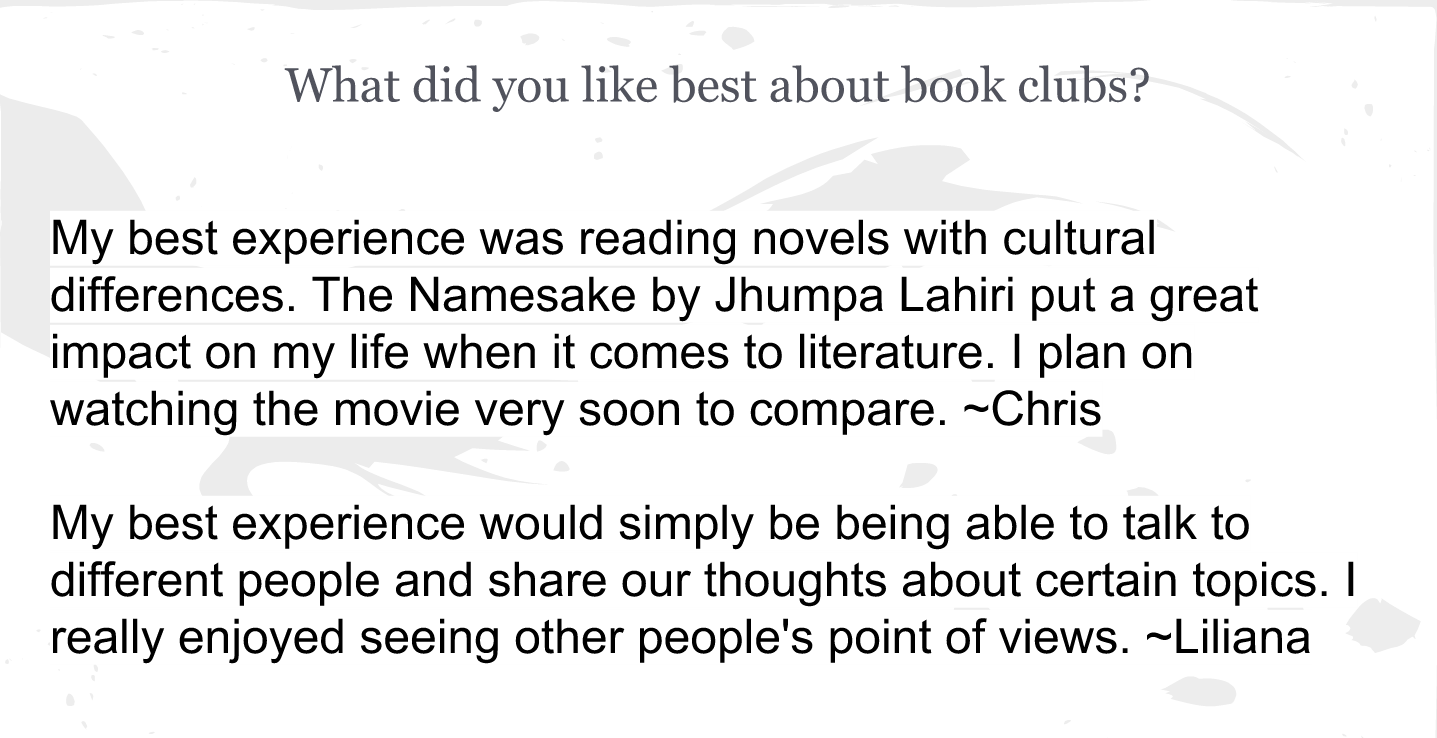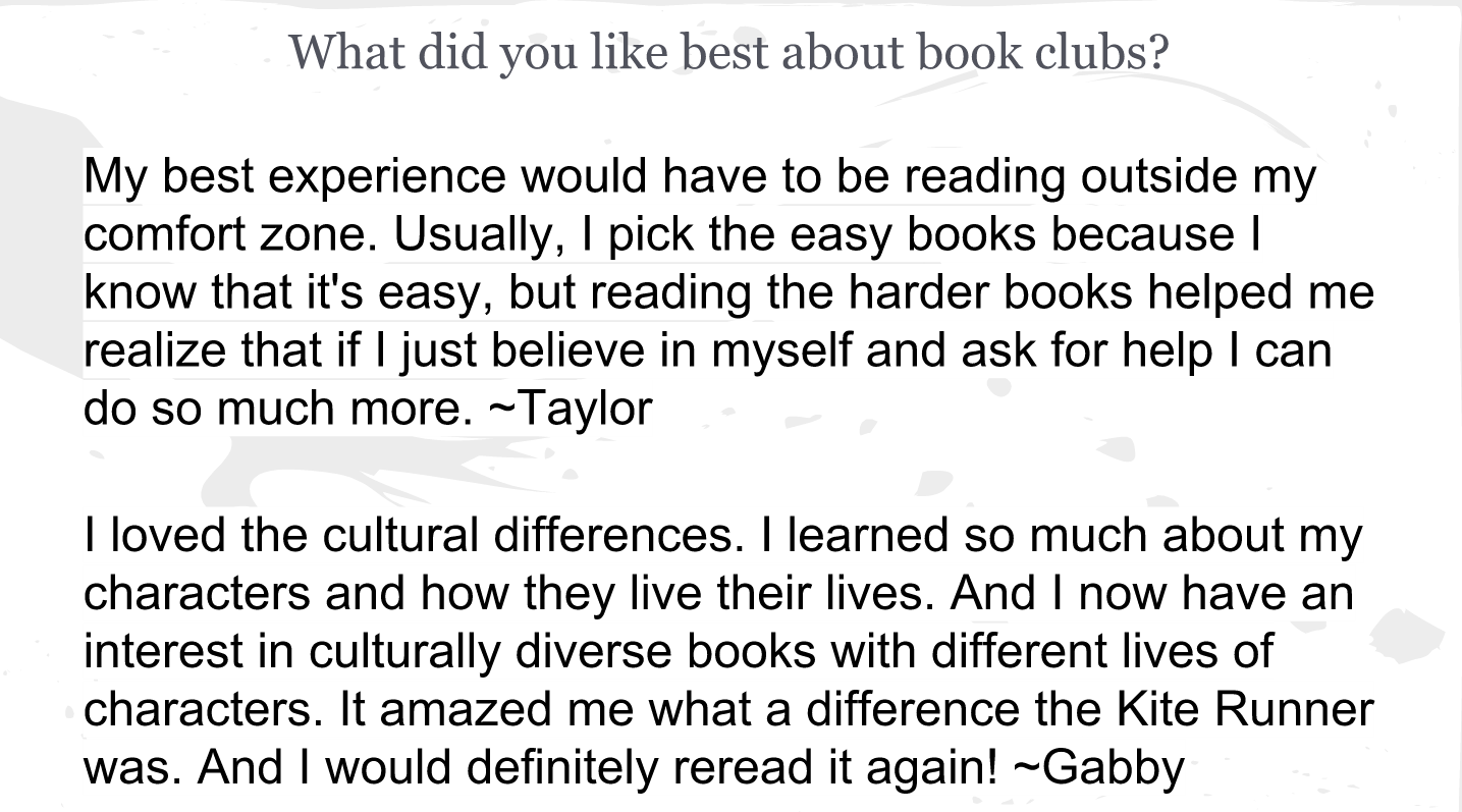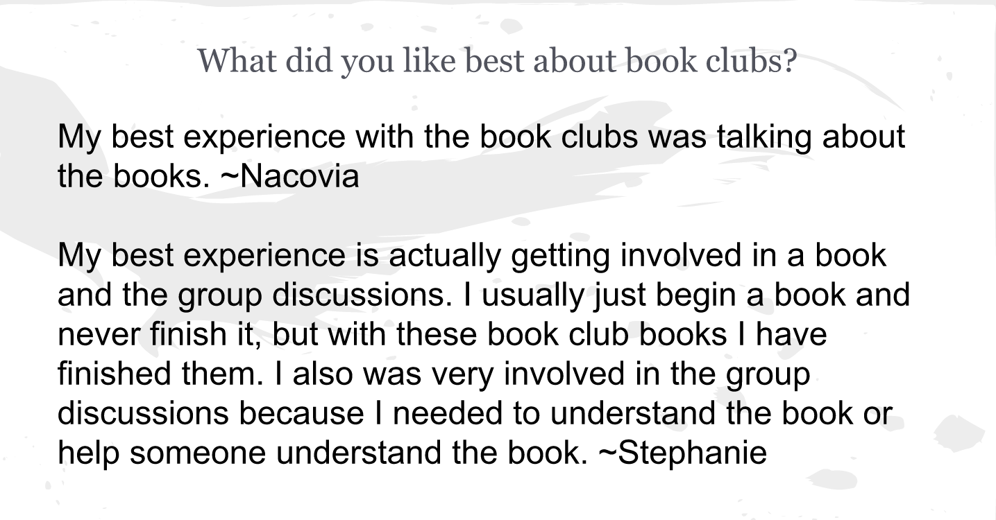 Some students never got their books and some students are still just on page 50 after five weeks of reading. In addition, we had students dropping other classes three weeks before the end of the quarter grading period and being added to our classes in the middle of book clubs.