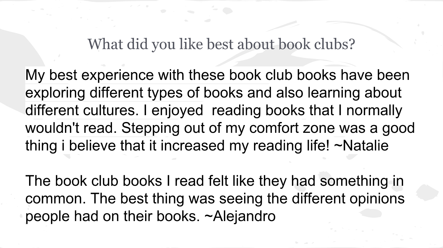I will not lie, the logistics and setting things up was a lot of work and overwhelming at times, but I am so glad we took the time to do this. My students are having meaningful conversations about their books, some are reading a whole book for the first time in years, and almost all engaging more than they have this year because of these clubs.
