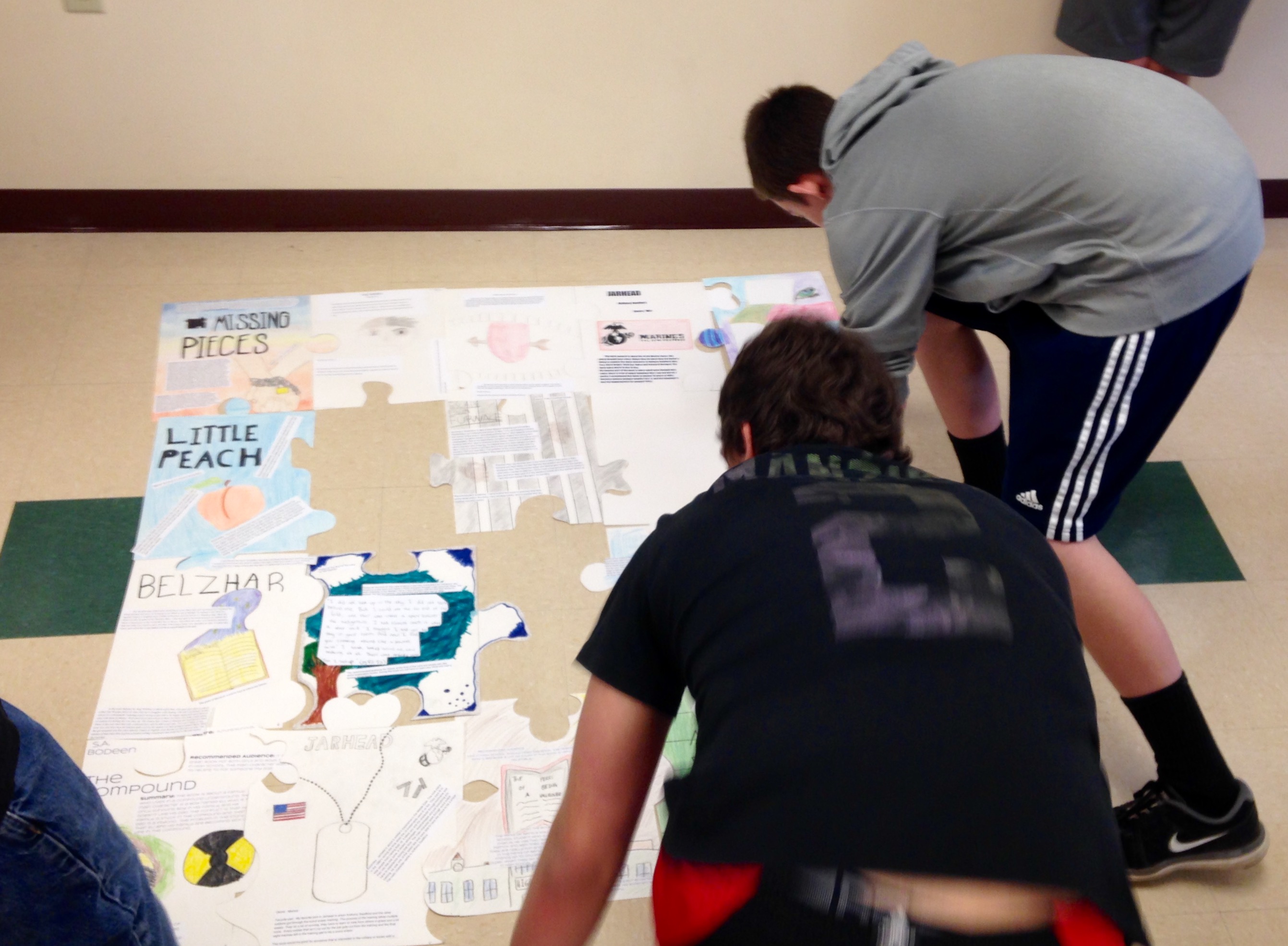 Students write out book talks on large puzzle pieces. I have students discuss their favorite parts of the book and to whom they might recommend it. Finally they draw their favorite scene, symbols, or images from the book. Once the puzzle pieces are complete, we share our final products, build the puzzle, and put it on display for our peers.