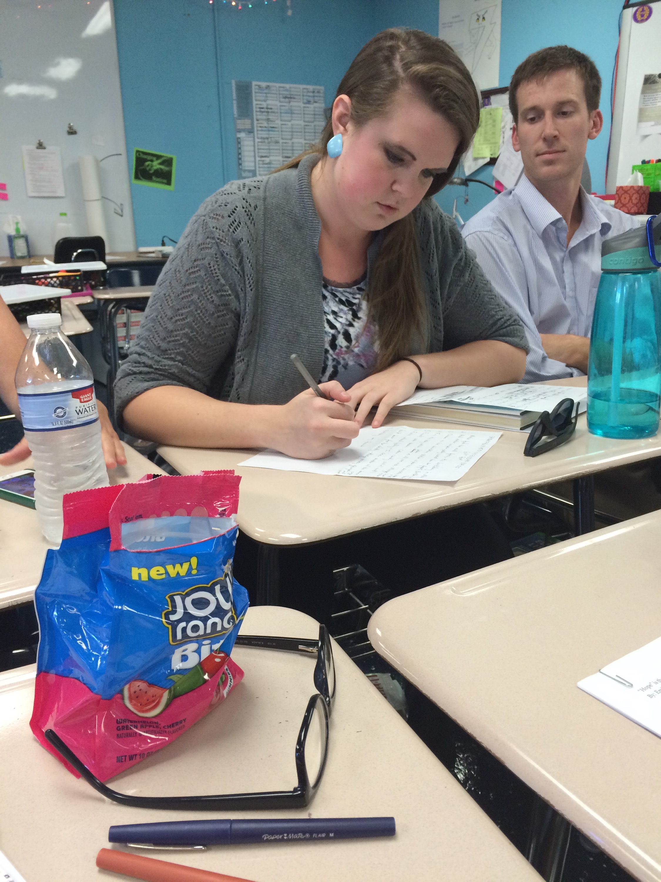 “I’m going to write with you, and I’m going to choose ‘A Display of Mackerel,'” I say. “It seems long, but look how short the lines and stanzas are.” I put my chosen poem under the document camera. “Now, this poem is about a display of fish, and I want to imitate it and write about a display of something. There’s a pretty big display of colorful objects in my room…” I trail off.