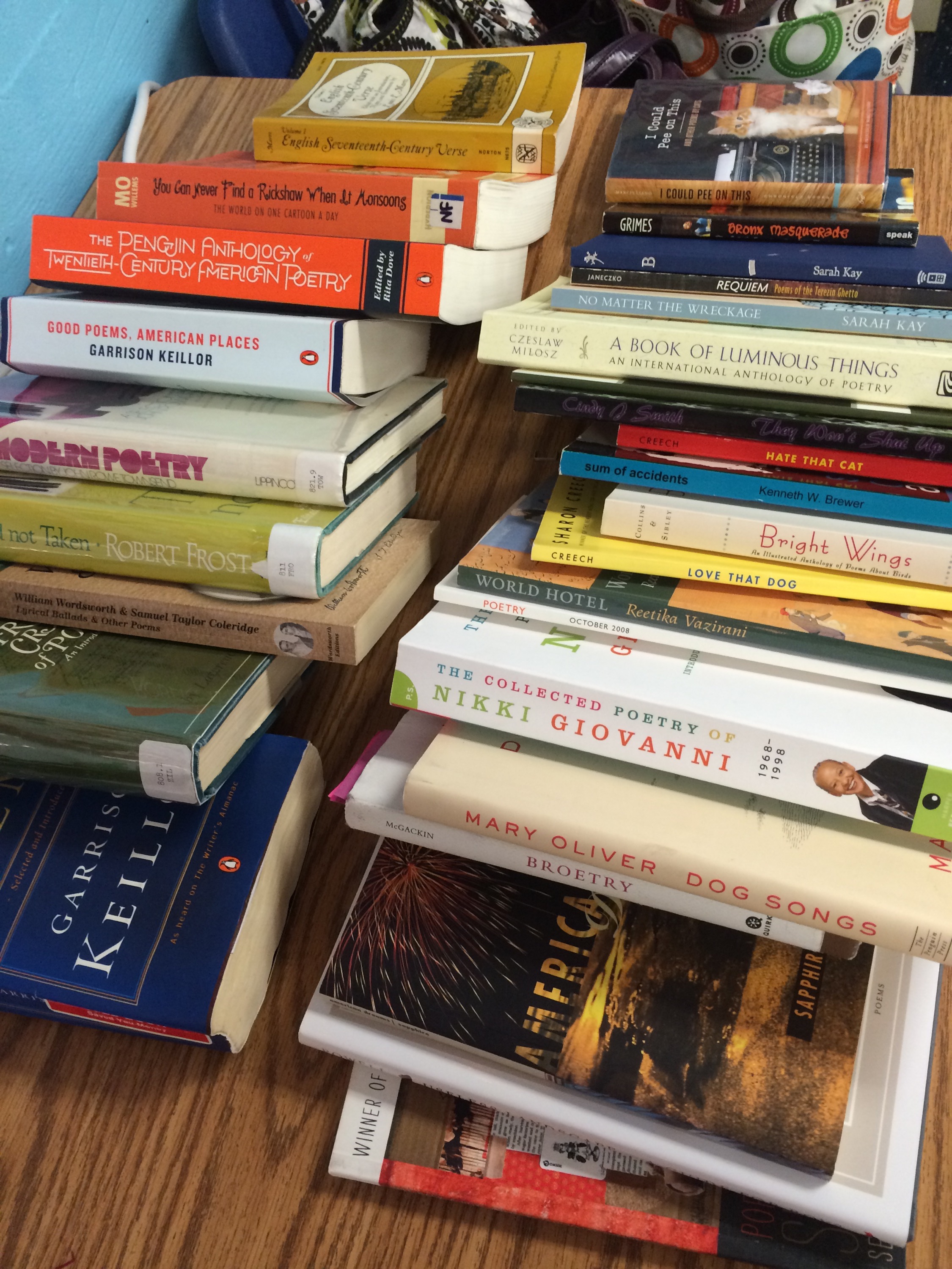 “See how easy that is? I keep Doty’s structure, punctuation, and even some of his words. I just change a few to make the poem about my display of books, rather than his display of mackerel. Now you take a few minutes to give this a start.”